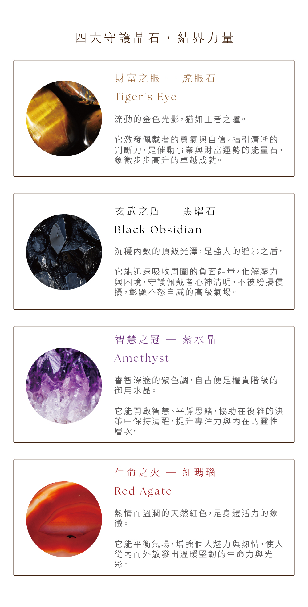 我們精心搭配四種擁有強大結界能量的晶石,為您搭建保護與運勢的磁場: